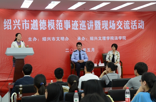 2015年绍兴市道德模范事迹首场巡讲活动于5月13日下午在我校河西校区图书馆一楼报告厅举行。绍兴市委宣传部部务会议成员、市文明办副主任徐人杰,绍兴市文明办城市文明创建处副处长李建华,第三届绍兴市道德模范潘旗龙、郭秀珍,法学院师生代表120余人参加了本次活动,共同感受道德模范事迹带来的正能量。活动还邀请了由我校师生代表组成的宣讲团中的三位同志为大家宣讲。