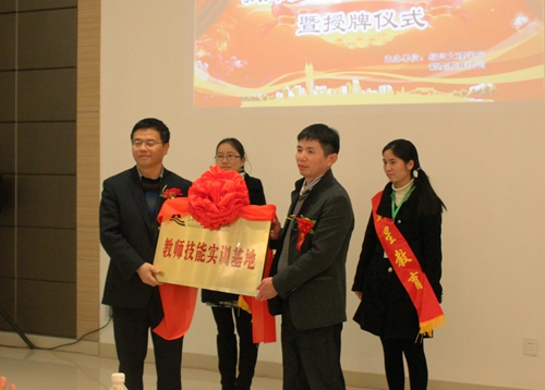 寿永明副校长代表学校向新星教育培训学校授牌。他向基地的成立表示祝贺,指出这是强化我校师范生技能训练、切实提高人才培养质量、提高毕业生实践与就业能力的重要举措,要求师范生们通过这种方式,快速将名师技能转化为自身技能,切实掌握本领,为将来走上教师岗位奠定坚实基础。