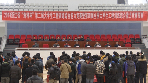 12月13日上午, 2014年浙江省“海特杯”第二届大学生工程训练综合能力竞赛决赛暨第四届全国大学生工程训练综合能力竞赛预赛开幕式在我校体育馆召开,包括浙江大学、浙江工业大学、杭州电子科技大学、浙江理工大学、宁波大学等在内的全省37所高校132支进入决赛的队伍,共396名学生参加了本次比赛。我校共有5支参赛队15名学生进入决赛。