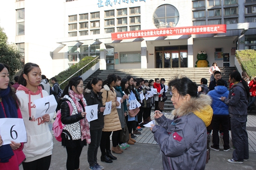 公寓门卫辨识学生(认人识面)治安防范比武中,每个门卫要从随机组队的20-25人学生群体中辨别出“自己幢区的同学”和“非本幢区的同学”,这不仅考察了门卫对自己幢区学生的熟悉程度,也能反映出门卫平日工作的安全意识。最后,南山15幢罗关美阿姨从随机组队的20名学生中准确认出本幢学生11名,非本幢学生9名,以认知率100%摘得桂冠。另外这项比赛还增设单项奖,对认出的学生,且能说出“学生姓名”或“寝室号”,可额外奖励。河西9幢娄亚萍阿姨在本幢11名学生中能准确说出“5个学生姓名”,“10个学生的寝室号”,获得额外最高奖励。