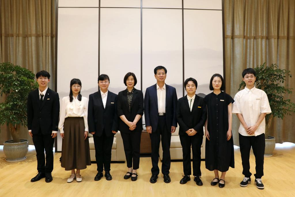 颁奖典礼前,俞可平、徐秀丽亲切接见获奖学生,与他们交谈。