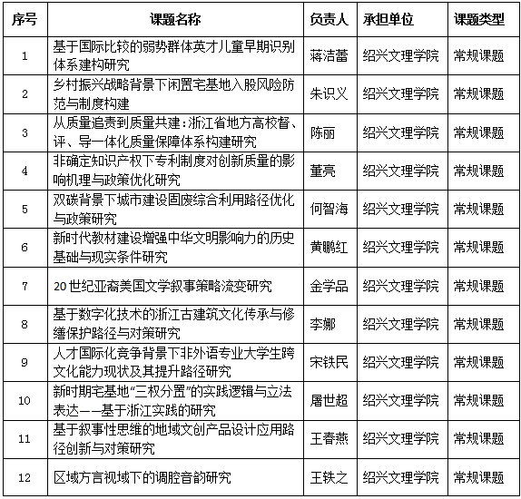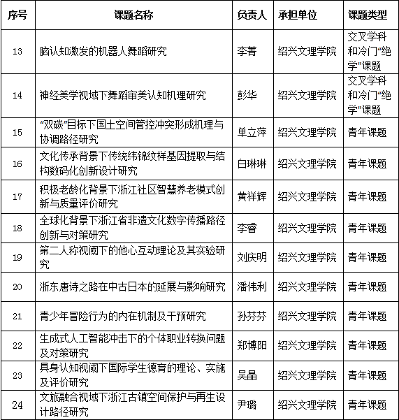 加上此前已公布的2024年度浙江省哲学社会科学规划后期资助课题获批3项(商学院周天肖主持项目《分权激励与集权控制:中央-地方关系下的国土空间规划治理模式研究》、艺术学院刘磊主持项目《“汪中旧藏《定武兰亭》”史料整理与研究》、商学院李春浩主持项目《数字化对制造业企业高质量发展的影响机制研究》);“高校思想政治工作”专项课题获批1项(马克思主义学院杜坤林教授主持项目《“Z世代”青年大学生价值选择与信仰塑造问题研究》);上半年公布的浙江省哲社重点研究基地课题获批3项(人文学院谢一彪教授主持项目《浙江堕民研究》、人文学院王敏红主持项目《近代民主革命先驱蒋智由全集整理》、人文学院梁苍泱主持项目《浙江近代文化转型人物研究--以夏曾佑、顶兰生、魏易为中心》);应用对策类课题获批1项(元培学院閤晓林主持项目《我省新业态灵活就业者社保缴纳存在的主要问题与建议》),今年我校省哲学社会科学规划课题立项数已达到37项(不含预立项3项)。
