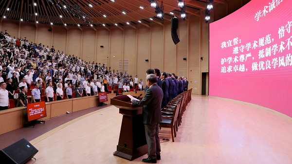 典礼举行了研究生学术诚信宣誓,浙江省特级专家、2020年国际工程地质与环境协会终身成就奖获得者、土木工程学院伍法权教授领誓。