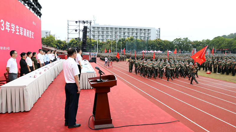 9月14日上午,我校在南山校区田径场举行2023年学生军训闭营仪式。绍兴军分区政治工作处上校主任金论川,越城区人武部中校副部长边建刚,校党委书记汪俊昌,校长赵阳,校领导沈赤、张宏、柳国庆、柯羽、陈均土,校军训领导小组全体成员,全体承训教官、参训学生参加闭营式。校党委副书记张宏主持闭营式。