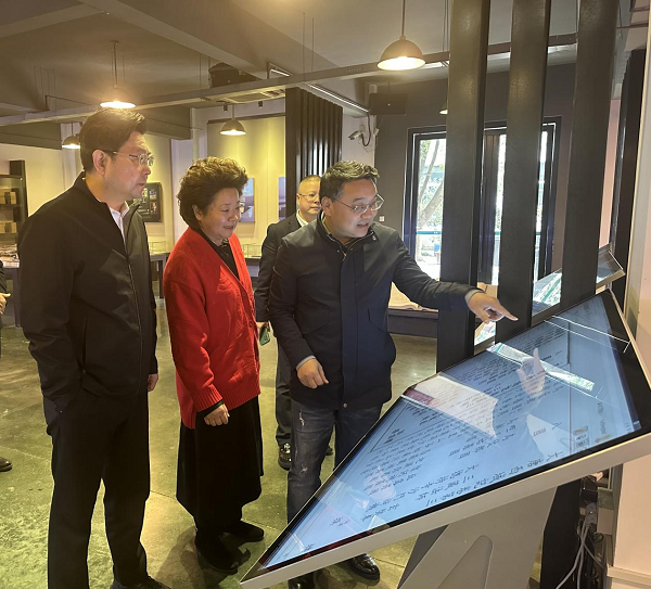 崔凤军一行参观了越生美术馆,寿林芬展示了中华珍稀古籍数据库、中国近代文献数据库,以及阳明数字文献馆、唐诗之路云展馆等数据仓库,同时展示了公司开发的古籍文献数字活化系统、文字检索替换系统等成果。
