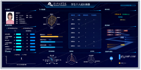 2024年1月,学校“数智评价”在2023级学生学期评价时全面试用,截止5月6日,现已全部完成2023级线上综合评价工作,生成4692位学生个人画像,15个二级学院群体画像。其中,数据库对接赋分数据111562条,职能部门管理员根据导入模板进行数据导入,系统根据导入字段实现赋分数据130542条,学生根据条目发起申请填写加分项具体内容、提交证明材料、提交审核进行申请数据877条,实现了平台数据对接、共享、录入、审核、赋分等完整功能和数据的实时更新及高效整合。