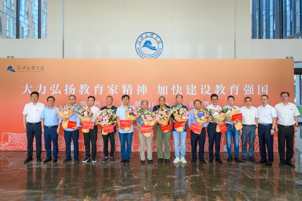 施惠芳向伍法权、王跃林、李圣华、张维加、杨圣奇、郁志新、吴宗大、严俊峰、沈润溥、赵伟强等十位教师代表送上鲜花,感谢他们对教育事业做出的积极贡献。施惠芳充分肯定了学校近年来所取得的成绩,希望全校教师能立德树人,起好表率作用,热爱岗位,奉献教育事业,同时要求学校关心关爱广大教职员工,营造良好的教育教学环境,为绍兴高质量发展,奋力谱写新时代胆剑篇培养和输送更多高素质人才。