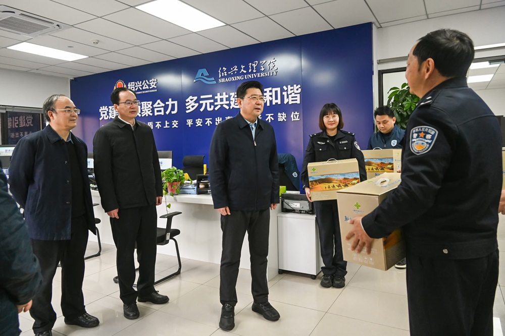 崔凤军一行先后来到校警务站、学校改扩建专班办公室、河西配电房、河西学生公寓成章书院、南山校区门卫、南山校区食堂、附属医院、兰亭校区等,亲切慰问了寒假期间依然坚守岗位认真履职的教职员工,向他们致以诚挚的问候,并代表学校党委行政送上了新春祝福和慰问品。