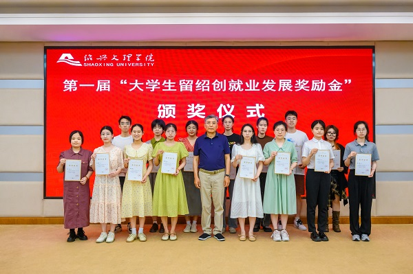 严建国为首届“大学生留绍创就业发展奖励金”获奖学生代表颁奖