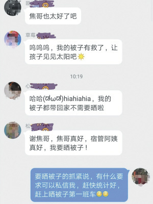 记者在现场看到,负责晒被子的宿管阿姨都戴着口罩和手套,且身着工作制服,“公司有统一的服务规范,大家都提前接受了培训。”严凤娟说,根据公司安排和“订单”需求,这些天,每位宿管阿姨预计要晾晒100多床被子。