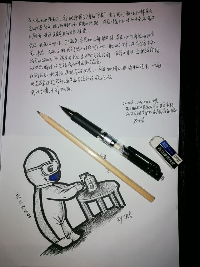 编者按:这是赴湖北医疗队员从武汉发给中国青年报的日记,记录了一线真实的工作状态。有人拿起画笔留存在武汉工作的珍贵记忆,有人创造性地解决防护服没有口袋的问题,他们默默对自己说加油,希望患者能早日康复。