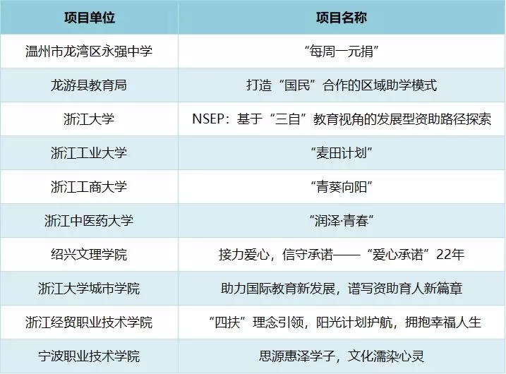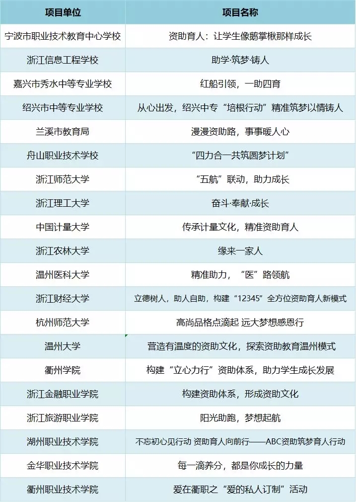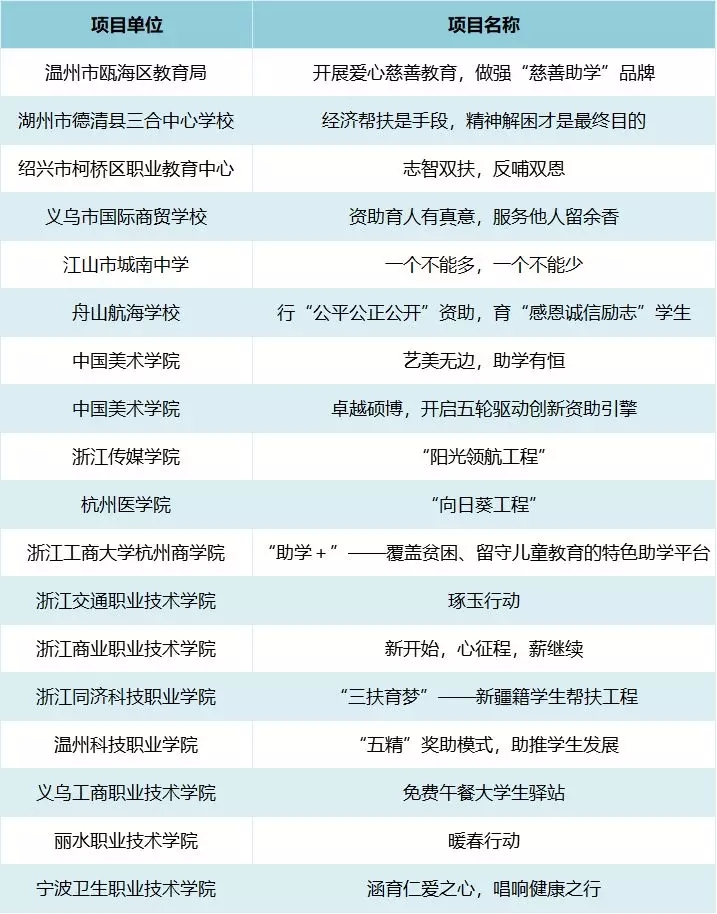 经专家评委和大众评委综合投票,《每周一元捐》等10个项目获浙江省学生资助文化“十佳品牌项目”;《资助育人:让学生像鹅掌楸那样成长》等20个项目获浙江省学生资助文化“精品项目”;《开展爱心慈善教育,做强“慈善助学”品牌》等18个项目获浙江省学生资助文化“优秀项目”。这些资助文化品牌项目是资助工作传承创新、勇于探索的成果体现,彰显了资助育人的成效。
