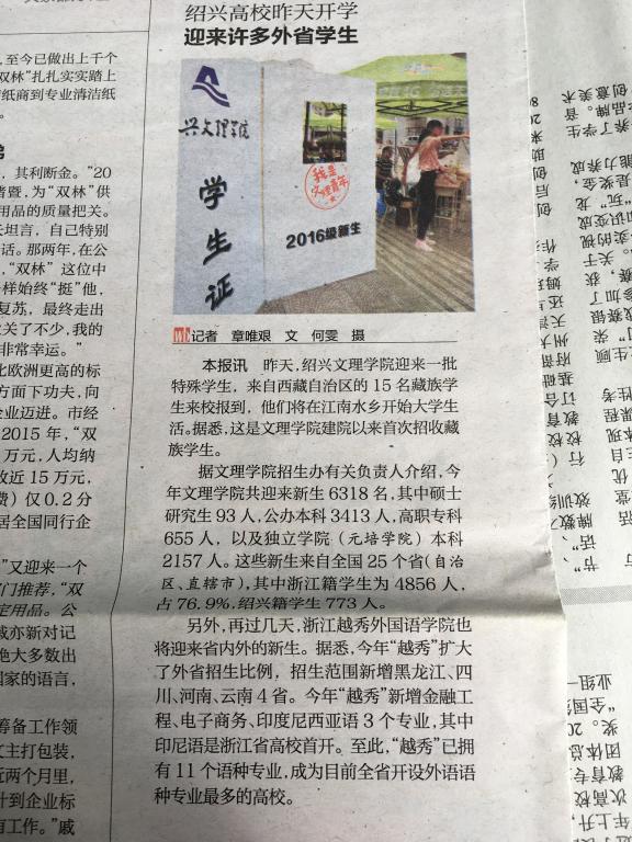 绍兴晚报:绍兴高校昨天开学 迎来许多外省学生