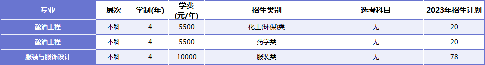 为落实国务院关于加快发展现代职业教育的决策部署,根据省教育厅的统一安排,结合专业人才培养特点,学校确定服装与服饰设计、酿酒工程等2个本科专业面向中职单独考试招生,计划招生118人,其中服装与服饰设计专业面向服装类招收78人,酿酒工程专业面向化工(环保)类招收20人、面向药学类招收20人。