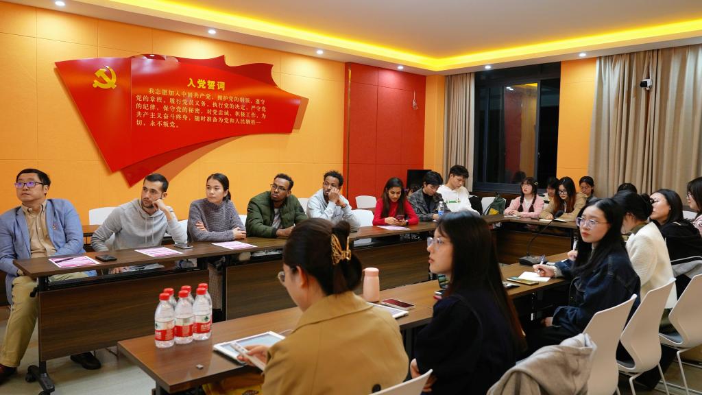 外国语学院学生宣讲团和国际教育学院党员教师代表杨奎向中外学生详细介绍中国共产党及党的二十大,号召大家抓住契机,认识真实、全面、立体的中国。