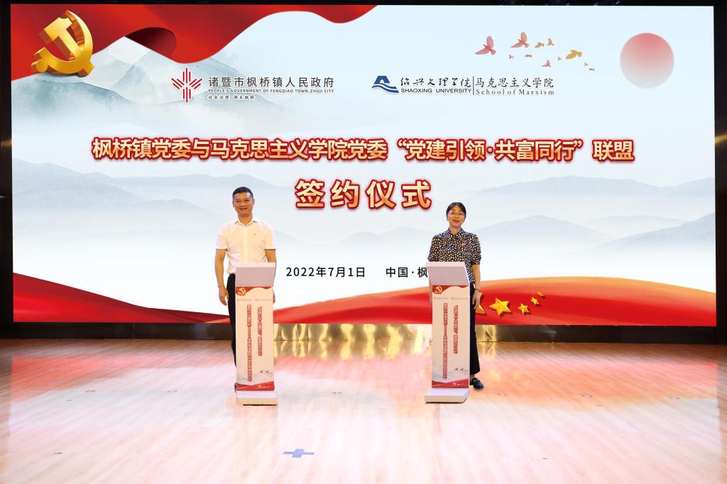 7月1日,马克思主义学院党委与枫桥镇党委“党建共建•共富同行”联盟启动仪式在枫源村文化大礼堂隆重举行。通过党建联盟签约、“大中小学思政课一体化”红色研学基地创建、暑期社会实践团授旗出征等活动,更好地把学深悟透习近平新时代中国特色社会主义思想与习近平总书记对浙江工作的重要指示精神贯通起来,把加强党的全面领导与实践新时代“枫桥经验”紧密结合起来,积极探索全方位战略合作共建,推努力形成互带互动、优势互补、资源共享、共同发展的党建工作新格局,以高质量党建推动高质量发展,合力擦亮“枫桥经验”金名片,共同续写“社会治理现代化”大文章。仪式上,少先队员们为“光荣在党50年”枫桥镇老党员献花,全体党员重温入党誓词,让在场的大中小学生们进一步感受榜样力量,让革命薪火代代相传。