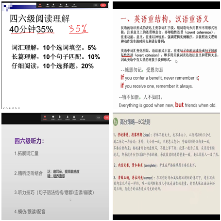 按疫情防控要求,本次系列讲座采用企业微信在线直播形式开展,每周一次,一个月内累计观看人数达1900多人次。讲座根据大学英语四、六级考试的题型设置,分为阅读、翻译、听力和写作四大专题,由王沫、张春英、李秀芳和陈东方四位老师分别担任主讲。各主讲老师结合考试大纲和多年的教学和阅卷经验,详细阐述了各类题型的解题步骤、解题技巧、得分要点、备考建议和注意事项等,为学生提供了易学实用的复习规划和应试指导,切实帮助我校学生解决在备考过程中遇到的难题。