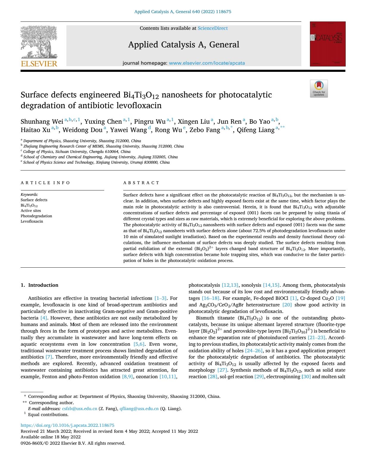 近日,数理信息学院微电子科学与工程191班陈禹行同学以共同第一作者在SCI 二区收录期刊《Applied Catalysis A-General》发表学术论文《Surface defects engineered Bi4Ti3O12 nanosheets for photocataly degradation of antibiotic levofloxacin》。《Applied Catalysis A-General》是主要收录对催化剂、催化反应新理解,包括新催化材料、新技术和新工艺等相关学术论文,影响因子为5.706。方泽波教授和梁奇峰教授为本文的共同通讯作者。