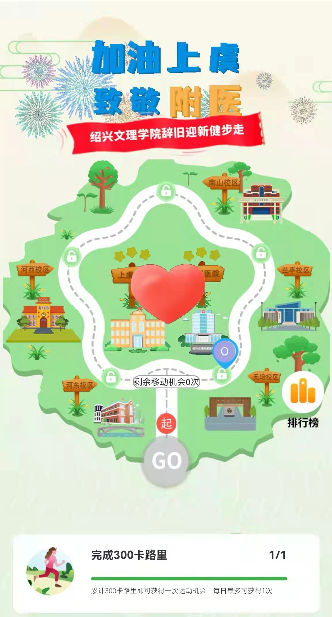 近日,校工会结合防疫防控要求,开展了“加油上虞 致敬附医”辞旧迎新健步走活动。活动首次使用人机一体化,与“绍兴体育”APP合作,采用累积运动卡路里模式,将线下运动与线上数据结合起来。累积300卡路里可以点亮一个站点,分别为河东校区、河西校区、南山校区、兰亭校区和元培校区,七天时间点亮五个站点即通关,随即上虞校区和附属医院自动点亮。活动还设置了运动排行榜,活动期间实时更新,前三百名获一二等奖。参加此次活动教职工约1100人,完赛通关达980人。