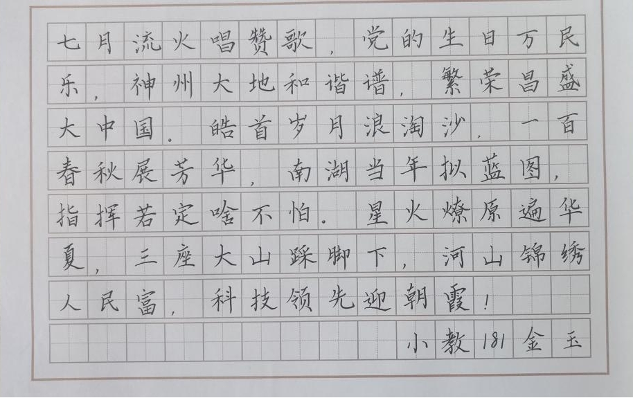 “三笔刻痕,爱国情深”,同学们以手中之笔,书写横竖撇捺,让爱国敬党之情在汉字中流淌。一把刻刀、几张红纸,寥寥数刀,镂刻出张张精美的剪纸,共庆我党一百周年。从南湖起航的红船,在历史的狂风暴雨中,仍不负使命、不负时代,创造一个又一个奇迹,大家用海报绘出这段伟大的征程。