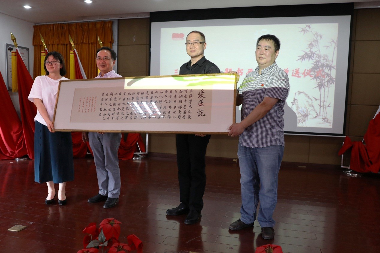校纪委副书记、纪检监察室主任陈林刚,纪检监察室副主任、机关第二党支部书记凌坚向水沟营社区赠送学校廉洁文化月优秀书画作品。