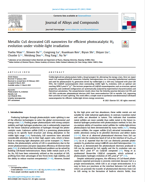 近日,数理信息学院物理学专业181班万跃虎同学以第一作者在《Journal of Alloys and Compounds》发表题为“Metallic CuS decorated CdS nanowires for efficient photocatalytic H2 evolution under visible-light irradiation”SCI学术论文。Journal of Alloys and Compounds是爱思唯尔旗下工程技术与材料科学领域的二区(小类一区)TOP期刊,影响因子为4.650。李春鹤博士和窦卫东教授为本文的共同通讯作者。