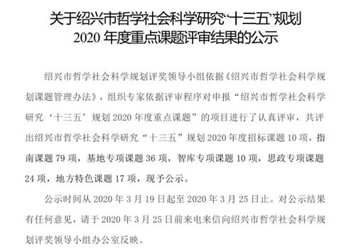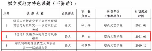 另外,研究生苏冉获批绍兴市哲学社会科学研究“十三五”规划2020年度地方特色项目。3月19日,绍兴市哲社规划项目2020年度课题评审结果公示。学院2018级研究生苏冉申报的地方特色课题《<伤逝>改编作品的类型与风格研究》成功入围。苏冉介绍,该课题拟从系统整理研究《伤逝》改编作品的文献入手,探究《伤逝》是如何被改编成为影视剧作品的,深入分析《伤逝》改编作品的类型与风格,深化相关学术研究。据悉,针对该项目苏冉及导师卓光平博士可谓积累深厚,至今已累计发表出版了7项相关主题的论文著作。为了增加立项的机会,苏冉利用“居家学习”的时机反复打磨申报材料,潜心征求导师的研究建议对本子进行反复修改。此次立项不光彰显了她独立开展科学研究的意识和能力,而且更是她“居家学习”不放松的珍贵成果。