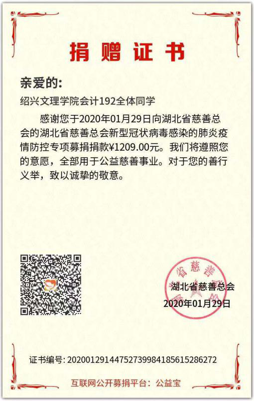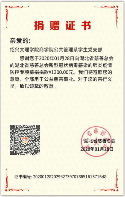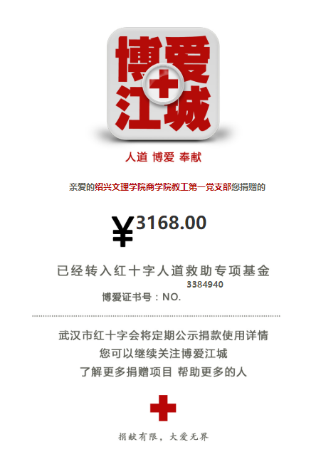 学院各党支部也积极响应上级党委号召,充分发挥基层党组织战斗堡垒作用和共产党员先锋模范作用,不忘初心、牢记使命,主动担当作为,在做好疫情防控工作的同时,伸出援助之手,倡议师生党员进行捐款,据不完全统计,截止目前已分别向武汉市慈善总会、武汉市红十字会等机构累计捐款12000余元,为坚决打赢新型冠状病毒感染疫情防控阻击战贡献力量,同时师生捐款还在陆续进行中。