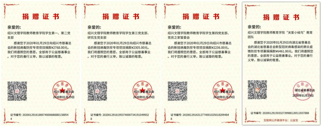 1月29日,教师教育学院各学生党支部、党员之家、“关爱小候鸟”教育团队通过网络发起募捐倡议,发起倡议半天时间,学院全体学生党员向“绍兴市慈善总会新型冠状病毒防控专项募捐”累计捐款7309元,“关爱小候鸟”学生教育团队向“湖北省慈善总会新型冠状病毒防控专项募捐”捐款6461元。