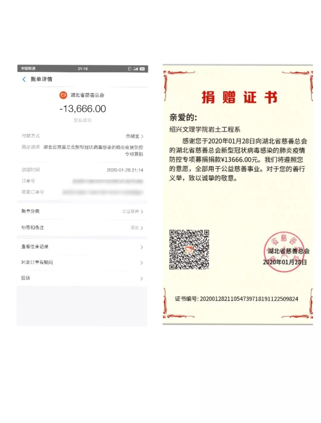 土木工程学院岩土工程系教工党支部在得知疫情后,自愿发起捐款。截止到1月28日晚,共收到岩土工程系党支部30位老师捐款共计13666元,全部捐赠给湖北慈善总会,用于新型冠状病毒感染的肺炎疫情防控。同时,支部捐赠500元购买口罩等物资邮寄给身在湖北、武汉的学院教师,帮助他们共渡难关!岩土工程系党支部书记沙鹏表示,“疫情严峻,牵挂着每位教师党员的心。大家在不同地方不约而同自发捐款,希望集绵薄之力支援武汉,为疫区助力,祝愿全国人民早日战胜疫情!”
