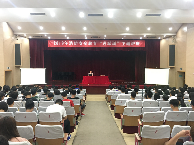 9月5日,学校2019级新生消防安全教育“进军训”专题讲座在河东月明音乐楼开展。讲座由绍兴市消防救援支队宣传科科长章鑫主讲,300名新生代表参加。
