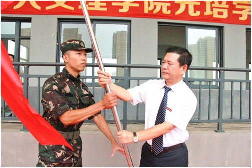 开营式上举行了庄严的升旗仪式。元培学院党委书记叶访春向军训团授团旗,院长沈红卫作军训动员报告,杨建富作军训讲话,军训教官和学员代表作表态发言。