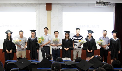 毕业生感念淳淳师恩。方小利、王元斌、祝汉灿、杨哲、王晓军老师接受毕业生献花并合影留念。