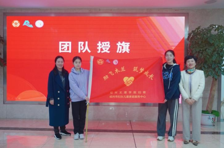市妇女儿童家庭服务中心副主任金妙红和教师教育学院副院长刘雄英为女大学生志愿者团队授旗。