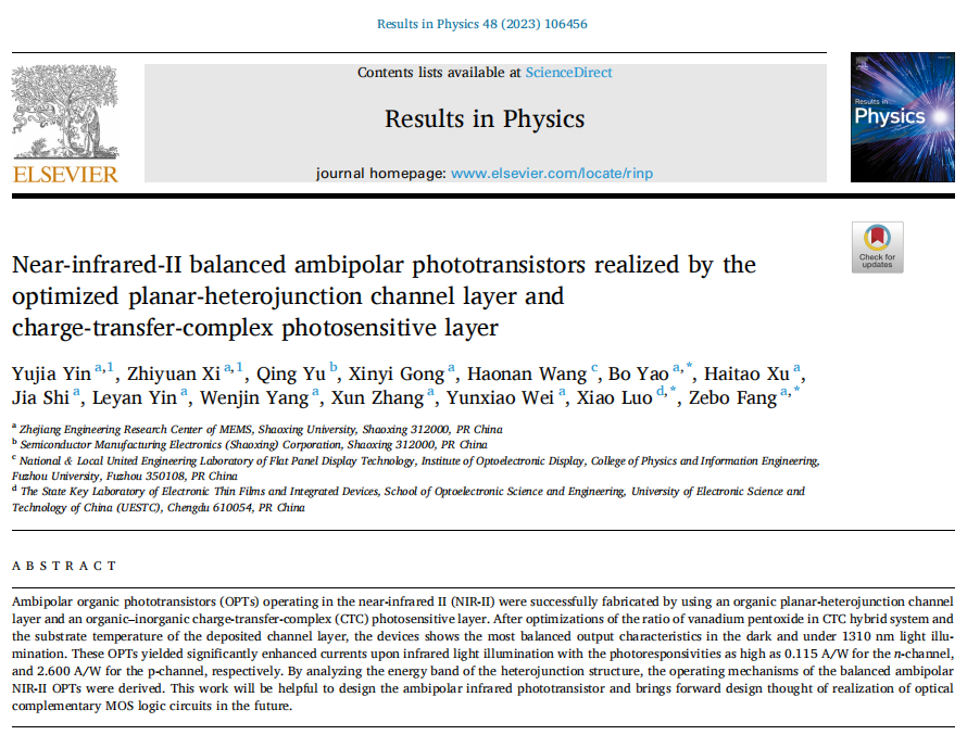 近日,数理信息学院微电子科学与工程专业191班尹宇嘉、希治远以共同一作在《Results in Physics》上发表题为《Near-infrared-II balanced ambipolar phototransistors realized by the optimized planar-heterojunction channel layer and charge-transfer-complex photosensitive layer》(Results in Physics, 48, 106456, 2023)的研究论文。《Results in Physics》是物理学、材料科学和应用物理学等学科领域的著名期刊,该杂志2011-2022年度影响因子为4.565,属中科院物理与天体物理大类二区。我院姚博副教授和方泽波教授为该文通讯作者,电子科技大学电子薄膜与集成器件国家重点实验室罗消教授为该文共同通讯作者。