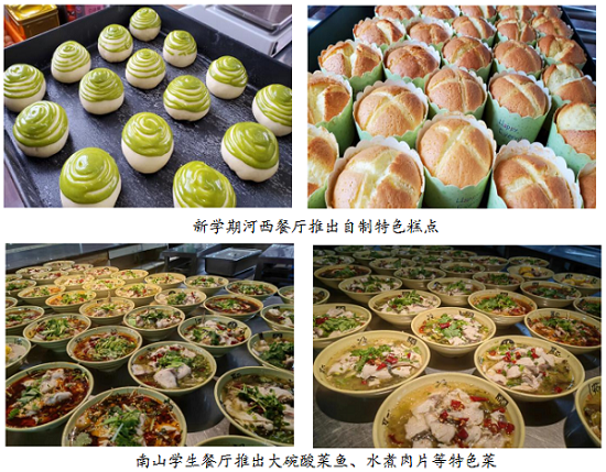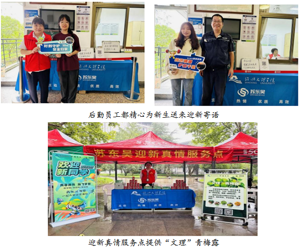 暖心暖意,提供贴心后勤服务。开学期间,各餐厅为新生和家长提供优惠套餐、免费凉茶等贴心服务,新学期学校餐饮引入高水平餐饮技能人才,推出特色美食,如河西学生餐厅推出自制特色糕点、南山学生餐厅推出大碗菜,美食城引入地方特色美食档口,提升餐饮服务品质,物业员工穿上志愿者服装,每个后勤员工都精心为新生送来寄语,在报到点设置真情迎新服务点,配置了独有的“文理”青梅露,温暖每一位学子的心田。