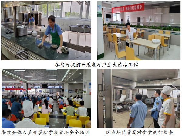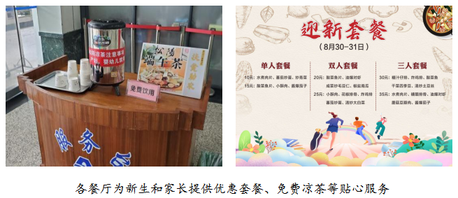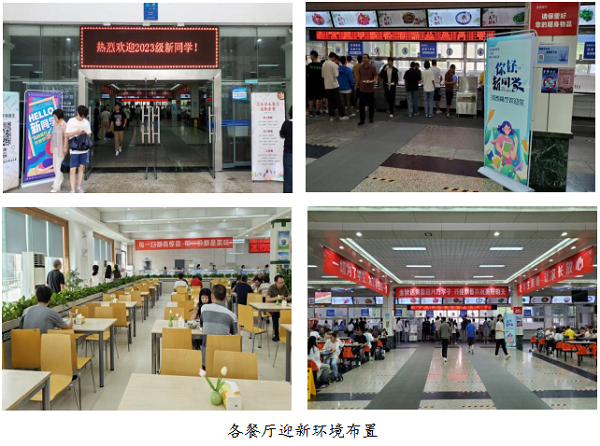 食全食美,做好开学第一餐。学校餐饮管理部门组织各餐厅提前开展卫生大清洁工作,对全体餐饮员工进行食品安全培训,联合市场监管部门开展全方位的食品安全检查,确保食品安全;各餐厅做好迎新环境布置,营造出文明、和谐的迎新氛围,让新同学有回家的感觉;迎新期间全校餐厅延长供餐时间,做到全天候供餐,满足新生报到需求;