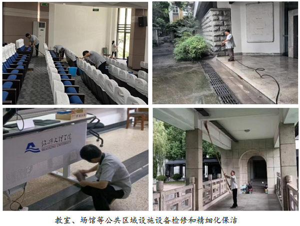 尽善尽美,打造整洁美丽校园。学校物业服务部门从八月中旬起,积极做好校园环境卫生清洁、设施设备维修、环境消杀和水质检测、绿化修剪养护等工作,对全校200多个教室、1000余间新生寝室以及各类场馆进行设施设备检修和精细化保洁,确保新学期物业服务保障工作。