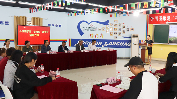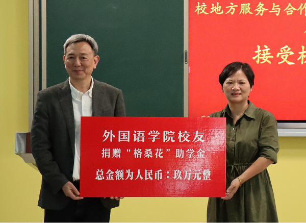 外国语学院党委书记吕志伟向与会校友代表颁发捐赠证书。外国语学院党委副书记金灵主持仪式。
