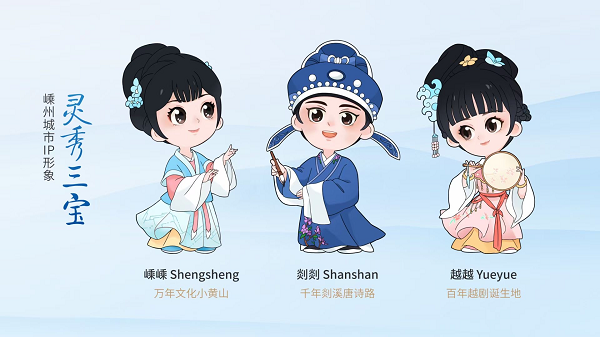 嵊州城市IP形象“灵秀三宝”,创意源自1600多年前的《晋戴逵剡山灵秀图》,现珍藏于台北故宫博物院,由宋徽宗御笔题名,乾隆题跋诗赞“山川灵秀称江南”。“灵秀三宝”IP形象寓意嵊州“万年文化小黄山、千年剡溪唐诗路、百年越剧诞生地”,分别取名嵊嵊、剡剡、越越。