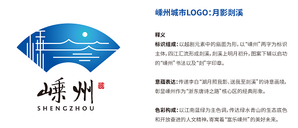 “湖月照我影,送我至剡溪”,一句诗演绎为一个城市LOGO,嵊州城市LOGO“月影剡溪”别具韵味。该LOGO意境幽远简洁大气,用扇面和线条勾勒出了越剧、唐诗、书法、剡溪等嵊州元素,营造了“湖月照我影,送我至剡溪”诗意画境,将现代美学与传统文化完美融合,蕴藏于江南的山水意境中。