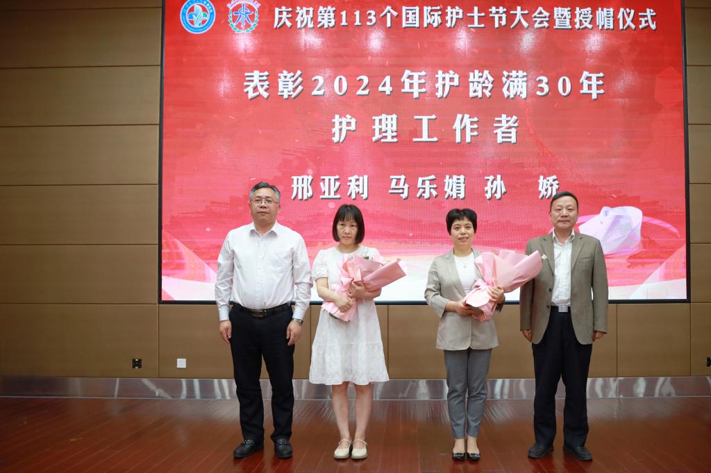 柳国庆、金红柱为护龄满30年护理工作者送花,为十佳护士长颁奖。会议还表彰了附属医院十佳护理组长、最美护士、2024年护理技能竞赛获奖人员、“互联网+护理服务”居家护理先进个人、“互联网+护理服务”护理咨询先进个人,校第十八届护理知识竞赛获奖学生等。