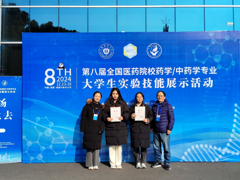 近日,第八届全国医药院校药学、中药学专业大学生实验技能展示活动在成都中医药大学落幕。化学化工学院药学221班郑依婷、张畅凭借扎实的专业基础和出色的实验技能分别荣获全国二等奖、全国三等奖,由胡纯琦、边可君共同指导。
