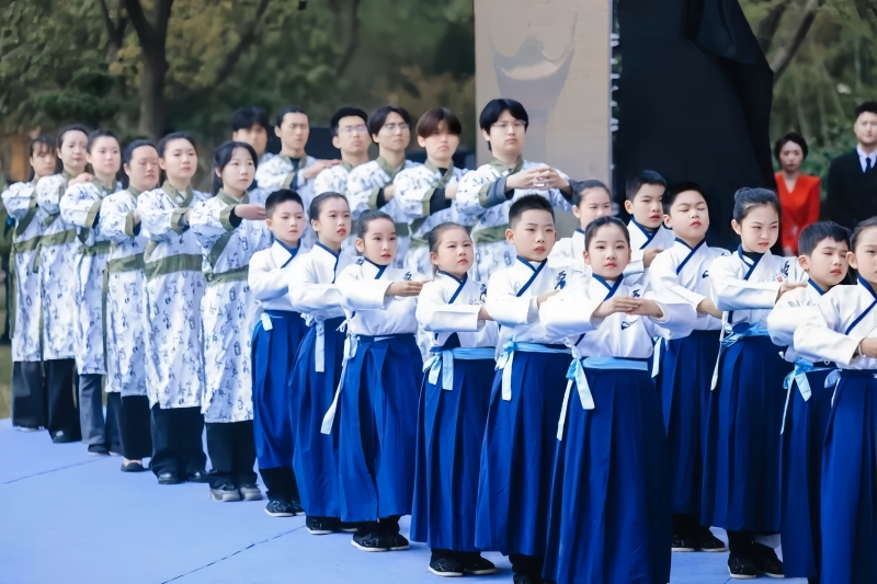 开幕式上,30余名学生代表身着汉服参与晋圣礼,以庄重仪轨致敬书圣王羲之,展现对传统文化的敬畏之心。活动中,学院将爱国主义教育融入实践,通过书法志愿服务,引导学生厚植家国情怀。学生尹正浩说:“在服务中,我深刻体会到书法不仅是技艺,更是民族精神的载体。”